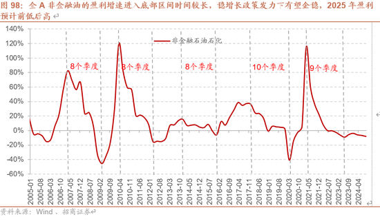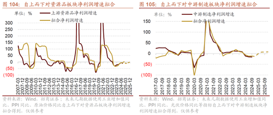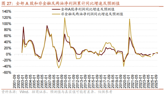 ● 空间上来看,参考工业企业盈利,随着一系列政策的出台,10月工业企业盈利边际改善,后续随着消费品以旧换新、设备更新等政策发力有望提振市场需求,2025年或可迎来逐季改善。预计2025年非金融全A增速在6.1%,节奏上预计随着政策效果的逐步显现,2025年业绩逐季改善。上半年抢出口对业绩仍有支撑,下半年政策效果逐渐显现叠加较低基数背景,预计业绩有望进一步改善。我们预测2024年的A股/非金融及两油A股上市公司2024年累计业绩增速仍在负值区间,2025年有望实现温和增长。A股非金融及两油盈利增速:中性假设下,四个季度的累计盈利增速为:-1.1%、1.6%、4.7%、6.1%。