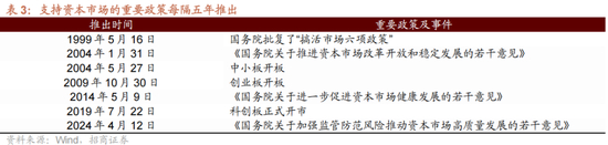 除了经济政策发力之外,对资本市场的支持政策也是有明显规律。我们在2019年,也就是五年前,就撰写了报告《A股投资启示录(六)——崛起的A股!五年一遇资本市场政策友好期再临》就描写了这个规律,就是每隔五年,要么就会推出一个新的板块支持资本市场,如2004年推出中小板,2009年推出创业板,2019年推出科创板,要么就会议国务院名义发布一个高规格的文件支持资本市场,1999年批复“搞活资本市场六条意见”,2004年国九条,2014年新国九条,2024年新国九条。