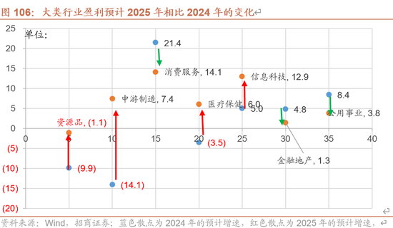 ● 大类行业盈利增速方面,2025年盈利增速相对较高的板块预计主要集中在消费服务、信息技术、中游制造等领域;资源品、医疗保健板块相比2024年盈利中枢预计上行。消费服务领域在扩大内需政策持续发力背景下,预计仍保持较高增速,但此前基数较高,预计增幅可能收窄;信息技术领域受益于新技术趋势的催化以及国产替代的加速推进,盈利增长确定性较高,其中电子、计算机、通信等均有望较2024年改善;中游制造随着供给端的逐渐出清,电力设备等对板块的拖累作用预计减弱;医疗保健领域一方面2024年基数较低,另一方面,反腐等短期冲击逐渐弱化,行业盈利低位修复;资源品板块由于需求端恢复仍存在不确定性,板块业绩预计仍处于负增长。