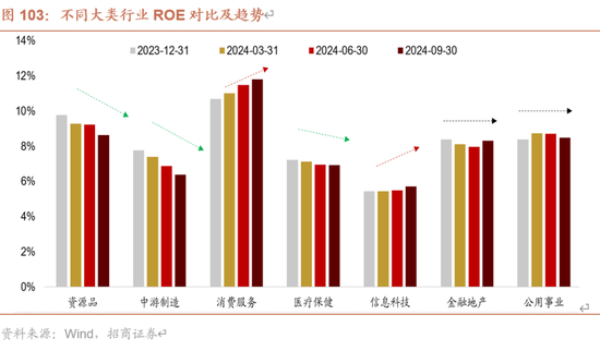 大类板块,资源品、中游制造、医疗保健板块ROE(TTM)环比呈下滑趋势,金融地产、公用事业板块的ROE(TTM)基本探底企稳;信息科技、消费服务板块的ROE(TTM)稳步提升(主要为电子、通信、商贸零售)。建议重点关注盈利有望反转的电力设备、国防军工、传媒、建材等;以及高景气维持的计算机、汽车、家电、电子、商贸零售。