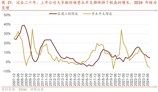 而此时,中国的总需求也没有出现明显的下降,一方面疫情管控政策彻底放开后,居民的消费增速在低基数背景下出现了持续回升;而2020年后疫情向全球制造业需求产生过一波明显的转移,加上以新能源、电子、医药等制造业领域的投资需求旺盛,中国的企业资本开支维持了相当高的一段时间高增长。最后,2022年之后,全球需求保持相对高位,在2022~2024年连续三年,中国出口形势均不错,出口、企业资本开支和居民消费抵消了房地产和政府支出下降的影响,使得需求保持了相对稳定。