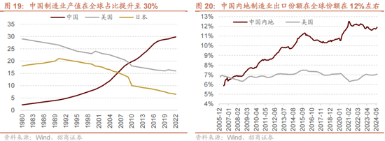 中国制造业在过去几十年经历了高速发展,在到2022年在全球制造业中产值占比接近30%,而在全球出口部分保持在12%左右。当前中国制造业在多数传统制造领域已经是全球领先,在过去几年新能源大发展的阶段,中国企业也凭借快速的技术突破和大规模资本开支扩产迅速崛起,在全球中的份额领先。