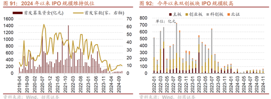 2024年以来IPO规模整体低位波动,平均每月募资规模均在百亿以下。以发行日期为参考,截至11月底年内累计共有90家公司进行A股IPO发行,对应融资规模572亿元。其中主板、创业板、科创板、北交所分别IPO规模190亿元、215亿元、124亿元、43亿元,创业板及科创板IPO规模占比较高。展望2025年,考虑到市场有望继续震荡上行,IPO发行节奏有望回归常态化,随着A股定位由融资市向投资市转变,预计2025年IPO规模维持平稳,如果按照月均100亿元计算,则预计全年IPO规模合计约1200亿元。