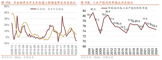 上市公司产能自2023年以来持续收缩,目前在建工程与资本开支增速均降至历史低位。非金融上市公司资本开支增速处于2010年以来1.7%分位。随着政策约束以及部分公司产能退出,部分领域有望在2025年迎来产能出清的拐点。
