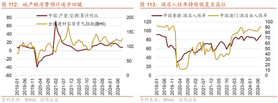 伴随着房地产托底系列财政政策和消费刺激政策逐渐加码、落实,2024年消费板块利润预计边际改善;尽管受去年同期高基数效应影响,预计今年整体盈利仍然较好。消费服务板块2024年全年利润有望维持双位数增长,其中出行消费在疫后的集中释放后有所放缓,以价换量特征明显,客单价有所下滑,但客运量、酒店入住率等指标同比延续改善;必需消费品需求稳定,成本红利持续,增速较为稳健;可选消费上半年表现较为低迷,下半年在以旧换新支持下边际改善;医药细分板块业绩相对改善,增速恢复稳健。展望明年,扩内需政策有望持续加码,房屋销售止跌背景下,地产链消费有望持续修复,必需消费品预计稳健增长,出行消费潜力有望进一步释放。医药板块,随着宏观经济需求改善,医疗反腐和集采政策影响消退,板块或将迎来复苏。
