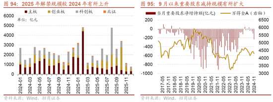 2024年重要股东二级市场减持整体有所放缓,重要股东减持主要集中在9月-11月市场好转阶段。截止11月30日年内重要股东二级市场累计增持741亿元,减持1159亿元,累计净减持418亿元。以截至12月6日收盘价格计算,2025年A股解禁规模2.98万亿元,相比2024年解禁规模2.64万亿元有所上升。
