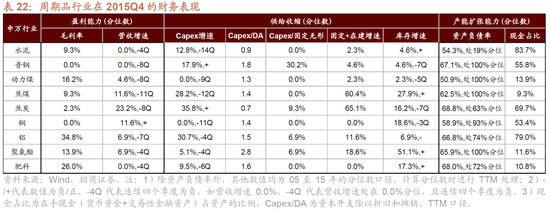 考虑到大宗商品价格在2015年四季度触底回升,选择2015年末作为行业出清的临界点,并将2015Q4视作该行业经营周期的底部。通过观察周期品行业在该期间的财务指标表现,以归纳出一些共性的财务特征。