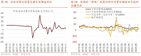 在这样的背景下,2024年推出了消费品依旧换新政策,并且在三季度开始发挥明显作用,在汽车、家电等耐用品增速明显回暖的背景下,消费增速出现了阶段性回升,然而,到了2024年11月,消费增速在去年高基数的背景下,再度回到了3%左右的水平。目前来看,消费需求的回暖,仍然需要政策更加大力的支持。