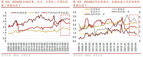 从一级行业看,2024Q3库销比向下的工业行业主要集中在机械设备、电子、计算机(主要是计算机设备),建议关注机械设备的底部反转机会;电子行业处在补库周期,但库存压力并未上升,有望延续景气向上;计算机(设备)库存拐点初现,有待继续观察。由于内需不足叠加产能过剩,其他工业行业库销比或多或少有所上行。从二级行业看,结合滞后相关系数,库销比连续两期下行且低于去年同期的工业行业主要集中在资源品中的贵金属和化学制品,机械设备的通用/轨交/自动化设备,以及农牧食饮领域的养殖和食品加工。