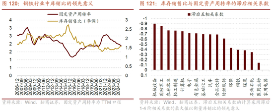 进一步结合库销比指标,产能周期上行的前半段往往伴随着产能利用率的提升,而库存销售比是产能利用率拐点的领先指标,背后原因主要是在一轮产能周期下行期中库存周期往往先于产能周期见底。库存销售比作为先行指标对于周期性行业以及中游制造业较为有效,当一个行业累库程度改善的时候(库销比见顶回落),此时很可能是库存压力接近释放完成,对后市预期较为悲观,维持低库存,且此时需求端也出现改善的迹象,行业整体可以从供需两端实现产能利用率的提升。