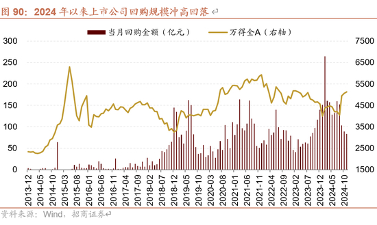 2024年1-11月上市公司回购规模先升后降,自9月市场好转后上市公司回购规模有所缩小,截止目前年内累计回购规模约1580亿元。10月18日,中国人民银行设立股票回购增持再贷款,支持维护资本市场稳定运行,预计上市公司回购的便利程度有望增加。11月15日,证监会官网正式对外发布《上市公司监管指引第10号——市值管理》,《指引》明确了市值管理的定义及方式,鼓励通过上市公司实施现金分红、股份回购等具体举措提高投资者回报,上市公司回购积极性有望增强。展望2025年,综合考虑前述三个因素,假设按照2024年月均回购约150亿元计算,保守估计全年回购规模约1800亿元。