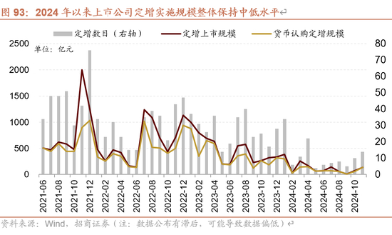 2024年以来上市公司定增实施规模整体保持中低水平,不过9月以来开始有所回升。以上市日期为参考,截止目前定增融资规模合计为1405亿元,其中货币认购定增规模1097亿元。展望2025年,目前处于正常流程且为现金认购的增发项目合计募资规模为3359亿元,其中房地产行业的再融资项目142亿元,非房地产和非金融行业的不受(破净、破发、连续亏损)等约束的项目合计募资规模为2867亿元,如果剔除计划募集规模较大超过100亿元的项目,则对应为2727亿元。但实际上因为还有募集资金投向、前次募集资金使用情况、财务行投资比例偏高等约束,实际不受限的项目会低于这个规模。因此,假设房地产行业的再融资项目都能够在2025年实施,以上统计到的非地产金融行业不受限项目中的50%能够实施(剔除募资规模超过100亿的项目),则合计募集规模为1500亿元。