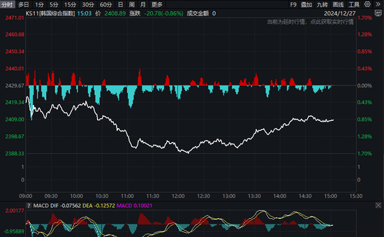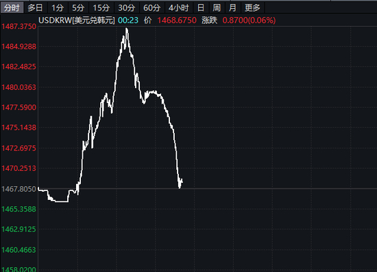 12月27日,韩国金融市场再次遭遇抛售潮。当天盘中,韩元对美元汇率跌幅一度跌至1美元兑1487.5韩元,刷新了15年多新低。不过,午后韩元又大幅反弹,截至券商中国记者发稿时,韩元对美元汇率跌0.06%报1美元兑1468.7韩元。