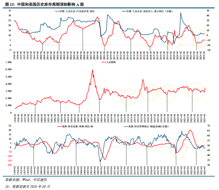 中美库存周期深刻影响A股走势,在美国去库存进入萧条期时,如果伴随国内周期同步去库存,整体A股表现相对较弱,特别是中国房地产周期(也就是常说的库兹涅兹周期)退化以后,海外的库存周期与朱格拉周期对A股整体走势影响很大。从当下看,我们处在新一轮库存周期的上升期,A股仍然会有韧性。