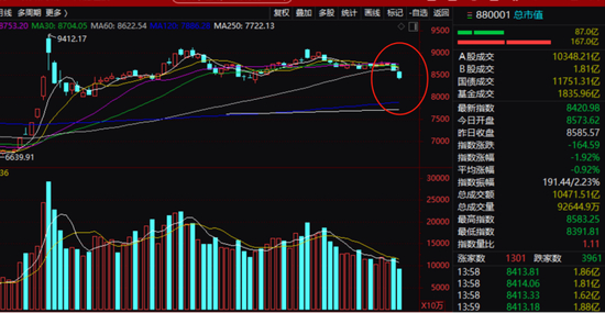 下午1点40分左右,三大指数均跌超2%,沪指失守3300点关口,保险、券商、军工、半导体等方向领跌,沪深北三市下跌个股超3900只,而早盘上涨个股一度超过3700只。随后,个别指数跌幅更是加大。跌幅个股增至20只以上,涨停个股则回落至50只左右水平。从指数形态上来看,今天全A指数已经破位,而中证1000已于节前最后一个交易日宣告破位。