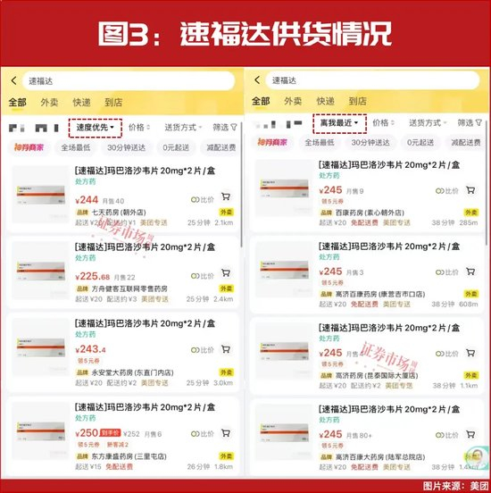 据报道,速福达(20毫克*2片/盒)的医保支付价为222.36元/盒,近期一度出现供货紧张的局面,且价格被炒到300元/盒。但目前在美团App搜索北京东城区,速福达供货药店较多,且打折前价格普遍在245元/盒左右(见图3)。