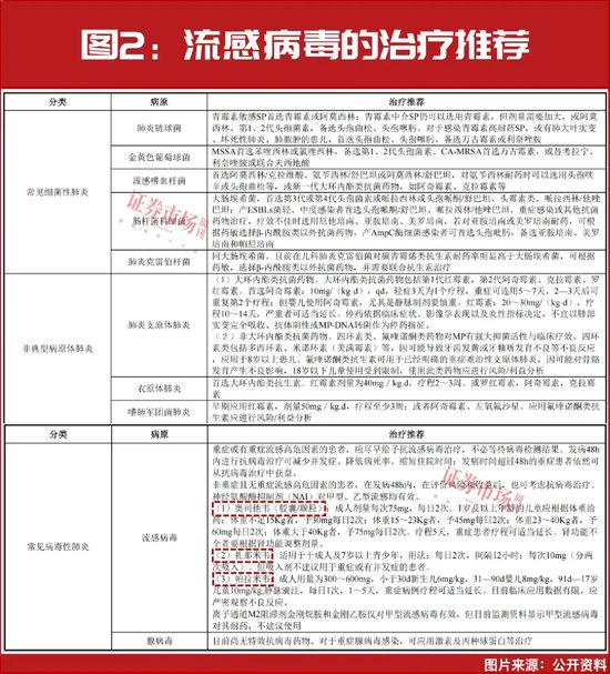 据《儿童社区获得性肺炎诊疗规范(2019 年版)》,其依据病原将肺炎分为三类,其中流感病毒的治疗推荐主要有奥司他韦(胶囊/颗粒)、扎那米韦、帕拉米韦三种药物(见图2)。此外,市场目前比较认可的药物还有玛巴洛沙韦(又称为“速福达”)、阿比多尔和连花清瘟胶囊等。其中,速福达由于全程只需口服1次,即可在1天左右停止病毒排毒备受市场欢迎,也被市场称为甲流“特效药”。