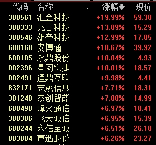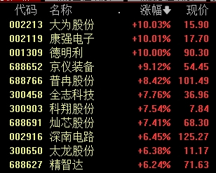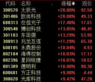 华塑科技、致尚科技、天迈科技“20CM”涨停,欧陆通、兆龙互连涨超10%。