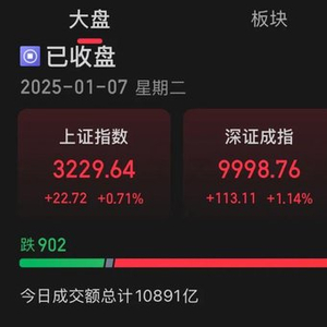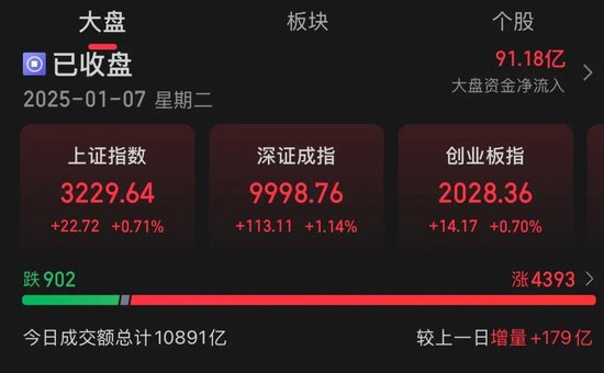1月7日,市场全天震荡反弹,大小指数走势分化,微盘股指数涨近4%。市场全天成交额10891亿元,较上个交易日放量179亿元。