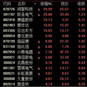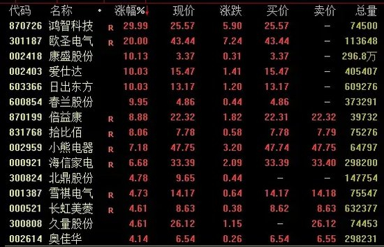 家电板块午后大幅走高,截至收盘,鸿智科技30%涨停,欧圣电气、康盛股份、爱仕达、日出东方、春兰股份等均涨停,倍益康涨近9%。