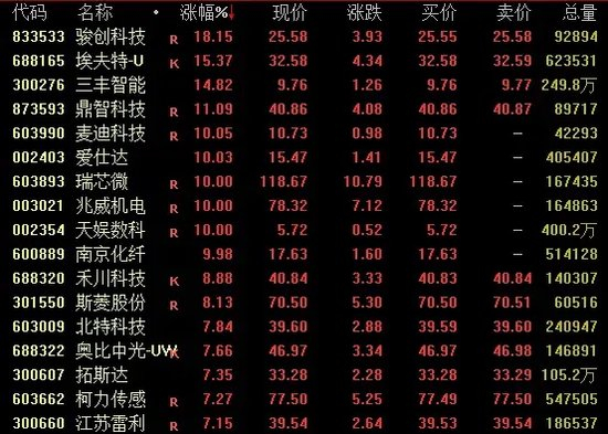 汽车板块亦有所表现,骏创科技涨超18%,巨轮智能、豪能股份、中国重汽涨停,斯菱股份涨超8%。