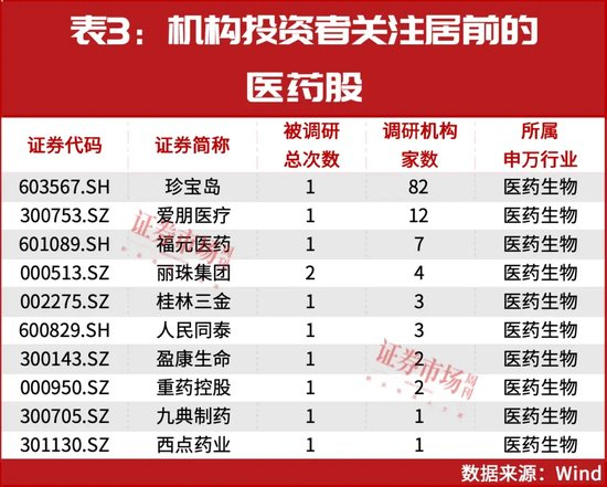 在科技主线之外,医药股也成了机构投资者主要关注的方向之一,涉及医药生物行业的个股多达10只。其中,珍宝岛获得了82家机构投资者的关注,仅次于易点天下(见表3)。