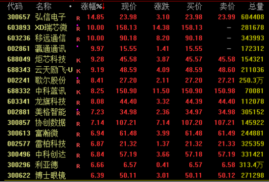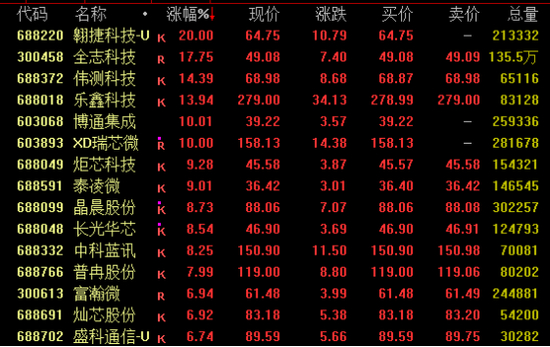 半导体板块盘中大幅拉升,截至收盘,翱捷科技20%涨停,全志科技涨近18%,乐鑫科技涨约14%,盘中创出新高;博通集成、瑞芯微亦涨停。