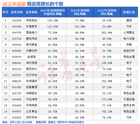 结合业绩预告、快报和年报数据来看,17股近3年净利润规模持续超5亿元,且净利润同比增幅持续超20%,业绩实现稳定增长。