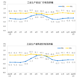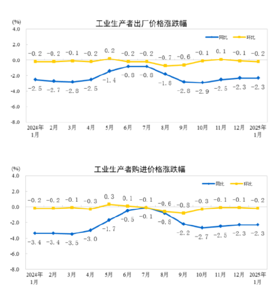 2025年1月份,全国工业生产者出厂价格和购进价格同比均下降2.3%,降幅均与上月相同;环比均下降0.2%。