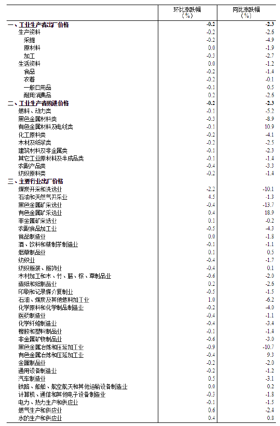 工业生产者购进价格中,农副产品类价格下降0.4%,黑色金属材料类价格下降0.3%,化工原料类、纺织原料类价格均下降0.2%,燃料动力类、有色金属材料及电线类、建筑材料及非金属类价格均下降0.1%。