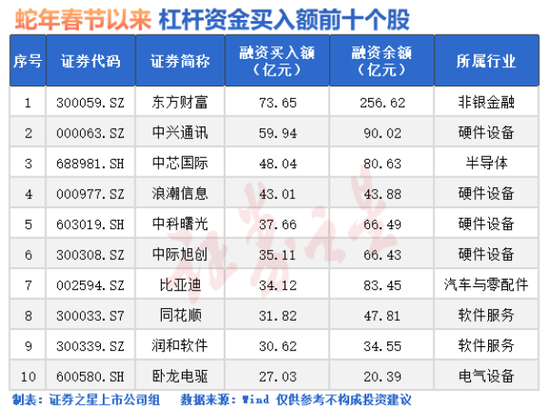 具体来看,非银金融龙头东方财富以73.65亿元的融资买入额居首。中兴通讯和中芯国际分列二、三位,杠杆资金买入额分别为59.94亿元和48.04亿元,资金流入态势明确。其他热门个股包括浪潮信息(43.01亿元)、中科曙光(37.66亿元)、比亚迪(34.12亿元)等,覆盖硬件、新能源车等高景气赛道。