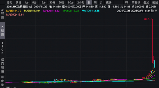 2月7日,涂鸦智能(02391.HK)对外宣布在其云开发者平台上集成了DeepSeek大模型能力,股价一度飙升逾220%,触及69.5港元/股,创历史新高,收盘涨43.13%。