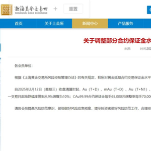 通知称,根据《上海黄金交易所风险控制管理办法》的有关规定,上金所对黄金延期合约交易保证金水平和涨跌停板比例,以及履约担保型询价合约保证金进行调整。自2025年2月12日(星期三)收盘清算时起,Au(T+D)、mAu(T+D)、Au(T+N1)、Au(T+N2)、NYAuTN06、NYAuTN12等合约的保证金水平从10%调整为11%,下一交易日起涨跌幅度限制从9%调整为10%;CAu99.99合约保证金每手65000元调整至每手70000元。