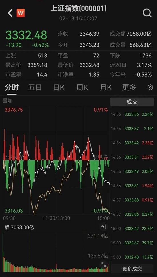2月13日,A股市场全天震荡调整,三大指数集体收跌。截至收盘,沪指跌0.42%,深成指跌0.77%,创业板指跌0.71%。