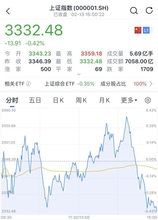 具体来看,两市股指盘中震荡上扬,到14时13分开始,主要股指全部跳水转绿,科创50指数跌超2%。截至收盘,沪指跌0.42%报3332.48点,深证成指跌0.77%报10626.62点,创业板指跌0.71%报2176.16点,科创50指数跌2.31%,北证50指数跌1.76%;沪深北三市合计成交18543亿元,较昨日增加逾1400亿元。