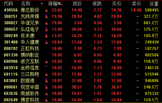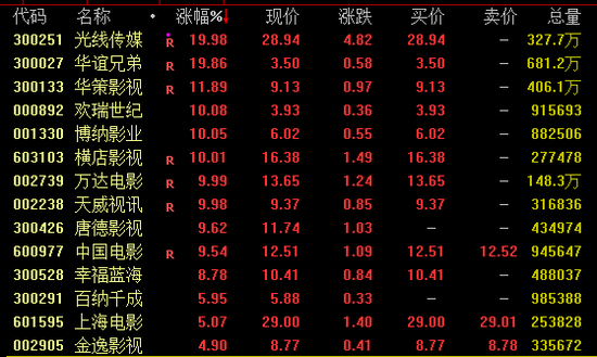 此外,华谊兄弟亦“20cm”涨停,华策影视涨近12%,欢瑞世纪、博纳影业、横店影视、万达电影、中国电影等均涨停。