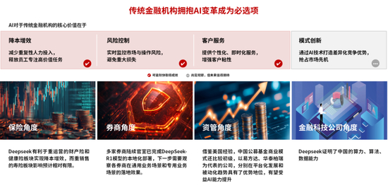 相比于两年前ChatGPT发布带来的影响,此次Deepseek创新推动大模型从闭源走向开源,大幅降低本地化部署成本和门槛。传统金融机构拥抱AI变革成为必选项,预计在降本增效、风险控制、客户服务等方面可能较快取得成效,而商业模式创新尚需观察。