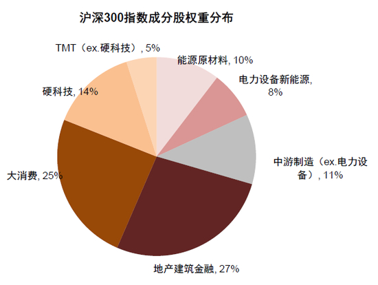 图表21:沪深300成份股中,中游制造及硬科技权重占比更高