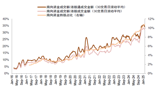 ►同期南向资金持续加大港股配置力度,对港股定价影响力上升。1)从整体净流入角度,2024年南向资金成交净买入7440亿元,创港股通开通以来新高,2025年开年两个月也大幅净流入2615亿元,不同于以往大涨期间南向资金放缓,本次呈现指数上行和南向资金共振,为港股提供了重要的流动性支持(图表10);2)从交易额占比来看,南向资金成交额/港股成交额自开通以来趋势性提升,2024年以来明显加速,当前南向资金交易额占港股主板平均已突破30%,若是占港股通交易额比重则高达35%。相比于2021年初的内地资金投资港股热潮时南向资金18%的占比,当前交易占比无疑意味着内资对港股定价的影响力进一步上升。3)从持股占比角度,南向资金持股占港股的比例也呈现趋势性上升,当前为10.9%,相比2021年初的5%也明显更高(图表11)。4)从机构投资者配置的角度,随着公募基金投资范围对港股的覆盖程度上升,2020年以来主动型公募基金对港股的配置比例明显上升,但2021-2022年港股下跌阶段有所回落,2023年以来公募基金对港股的配置比例再度上升,并且在2024年由年初8.3%提升至12.7%,与此同时在A股的配置比例有所下降(图表12)。我们认为主动型公募的行为在机构投资者中或有一定的配置代表性。5)从结构层面,南向资金的配置偏好主要有两类,一类具有更高股息率的红利资产,2022年以来南向资金大幅增配高股息央企,其中中国电信、中国神华南向资金持股占流通港股的比重超50%,并且截至目前港股核心央企的股息率仍相比A股平均高出1.7个百分点;另一类主要是从稀缺性角度,配置A股相对缺少的市值较大的互联网等“软创新”板块,以及部分生物科技标的,南向资金在主要科技龙头的持股占比同样也上升至10%以上(图表14-图表16)。
