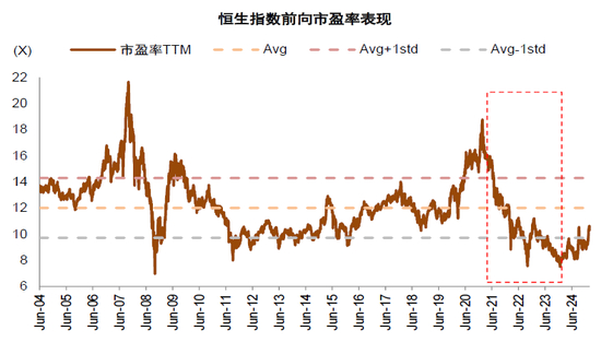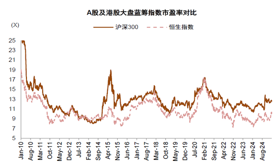 2)从估值和股东回报角度,港股也具备吸引力。长期以来港股相比A股存在明显的估值折价,即使在2025年初以来港股的这轮大幅上涨之后,当前恒生指数与沪深300的市盈率TTM分别为10.0x和12.6x(图表22),港股仍有估值优势。结构上按照内资偏好的红利与科技成长两侧来划分,AH两地上市的典型红利标的中,港股股息率明显高于A股,普遍高出1.7个百分点,对于重视分红回报的险资而言港股红利资产具备更强的吸引力(图表23);从科技成长类行业来看,港股的互联网龙头普遍ROE水平高于10%,在本轮上涨之前估值接近于传统行业(图表24),例如京东集团对应的2024年预测市盈率不足10倍,腾讯控股不足15倍,在本轮修复过程中,我们估算的“科技十巨头”的市盈率估值整体从12倍修复至17倍左右(图表25),相比A股和海外企业仍有估值吸引力。而且港股互联网龙头近年积极开展股票回购,例如腾讯在2023年年报中宣布将开展不少于千亿港元的股票回购计划,即使成长性相比过去有所下降,但良好的股东回报使其仍然具备吸引力。