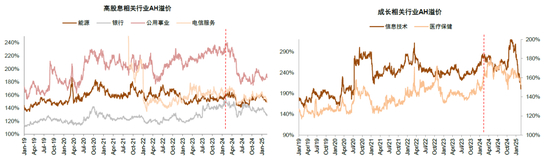 ►1)2024年初以来AH溢价趋势性回落。2024年初A股和港股共振见底以来,港股出现了三轮较为明显的上涨行情,其中2024年3月-5月以及2025年1月中旬以来的两轮行情明显跑赢A股,恒生沪深股通AH溢价指数(HSAHP.HI)在2024年2月突破161之后,开始趋势性下行至130附近,即AH两地上市股票价差出现趋势性收敛。AH价差收敛在过去几年并不罕见,但2019年以来的价差收敛通常幅度较小且持续时间短,通常持续时间不超过半年(图表3)。从结构层面来看,本轮价差明显收敛主要为两类行业,一是金融、公用事业为代表的红利低波板块;另一类主要是前期溢价高,并且当前景气回升的信息技术板块(图表4)。