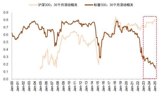 4)内资对港股的影响力上升,也帮助对冲主动外资阶段性流出时的影响。2021年初内资大幅南下之后,港股在3年期间调整较多,内资偏好的恒生科技指数最大跌幅一度达到75%,甚至有个别机构重仓股出现90%以上的跌幅。这个过程伴随的是外部美联储大幅加息,以及地缘政治风险上升,美债收益率和美元大幅走强,外资阶段性流出压力较大,港股指数跌破以往的估值中枢下限(图表27),当时即便港股估值以及优质企业具备吸引力,内资对于港股的配置仍相对谨慎。但是随着外资流出高峰已过并且达到明显低配的状态,美国通胀拐点出现以及美联储从停止加息到开始降息,10年期美债收益率自2023年10月突破5%以后,市场暂未预期美债收益率进一步打破上限,年初以来中美关系的边际变化也好于此前的偏悲观预期。与此同时,外资在港股份额的下降也对应南向资金份额的上升,当外部风险下降以及对于外资流出的担忧有所下降,且内资对港股定价影响力上升,在此背景下恒生指数与标普500的相关系数降至2000年以来最低,但是与沪深300指数的相关性处于历史高位(图表28)。可以预期未来内资将更加基于公司基本面、估值等因素在A股和港股做出选择,南向资金流入与内资影响力提升形成了积极的正反馈。