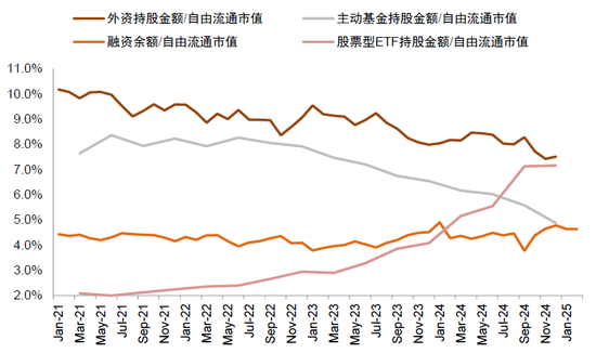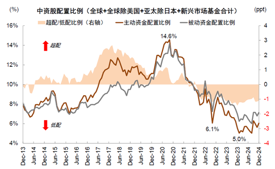 ►近年内资对A股及港股影响力进一步提升,外资影响边际略减弱。2021年以后伴随海外地缘风险上升和美联储货币政策变化,外资在中国市场的配置发生变化。境外资金在A股的持股市值2021年年末高峰期为3.9万亿元,至2024年底降至2.9万亿元,持股占A股自由流通市值也从2021年初的10%左右降至7.5%,内资占A股自由流通市值比重进一步提升(图表7)。港股作为外资更集中配置的市场,参考EPFR数据,2022年以来投向全球的主动基金对港股呈现净流出,对中资股的配置比例从前期的超配转为低配,截至2024年底低配约1.1个百分点(图表8),可能意味着当前外资对于港股的定价权相比过去边际减弱。被动资金仍呈现一定的净流入(图表9)。