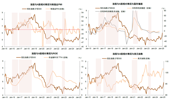 ►2)历史上港股跑赢依赖“内部经济强,外部美元弱”,本轮并非如此。2023年年初我们发布方法论报告《如何在A股和港股中做出选择?》认为,A股和港股有五大核心差异:a)投资者结构:港股海外机构投资者占比高,A股个人投资者交易量占比较高,内外资认知差异导致价差;b)交易制度:港股如个股卖空机制等影响价差;c)流动性:港股流动性弱于A股,并且对外资较为依赖;d)港股的再融资机制等相对宽松;e)汇率:投资者需要承担人民币兑港币汇率的敞口。由于外资影响相对更大,使得港股表现一方面依赖我国的基本面,一方面受外部环境和资金面因素影响更大,卖空机制和流动性影响估值定价,成为A股与港股表现差异的原因。我们通过复盘历史上港股持续跑赢A股的区间(如2015.6-2016.9、2016.12-2018.6、2020.10-2021.4、2022.11-2023.1),发现国内经济基本面和企业盈利明显走强,或者海外流动性宽松配合美元走弱,往往是港股跑赢的重要背景,此外地缘风险下降也是港股跑赢的重要环境(图表5)。