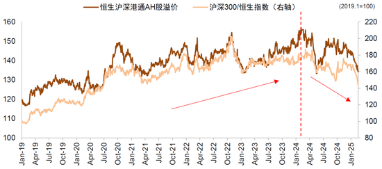 图表3:2024年年初以来,AH溢价水平在经历了5年上升后出现趋势性回落