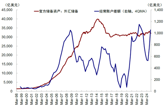 事实上,AI和关税这两大变量与国际收支表的“两本账”(金融账户与经常账户)息息相关,且互相关联。AI趋势吸引资金流入,直接影响金融账户(反映金融资产交易),关税政策则影响进出口,改变经常账户(反映实际资源流动)。原则上,一个经济体的经常账户余额与资本及金融账户余额(包括储备资产)等于零,因此一者的强弱也已影响另外一者。