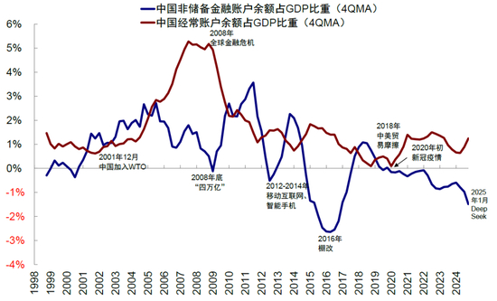 ► 金融危机后(2008-2018年):经常账户顺差收窄、金融账户三升三降。外需萎缩导致出口下降,2018年还受到中美贸易摩擦的扰动,经常账户顺差持续收窄,占GDP比重于2011年、2014年以及2017年后三度降至1%,2018年一季度更是出现加入WTO以来首次逆差。在此期间,非储备金融账户顺差却出现三轮明显走阔:分别对应1)2008年国内“四万亿”经济刺激,2)2012~2014年移动互联网及智能手机行情吸引的资金流入。2015年市场冲高后大幅回调导致非储备金融账户在此期间转为赤字,占GDP比重2025年底回落至-3.3%,直至3)2016年至2017年棚改货币化催生的牛市才再度转为顺差。