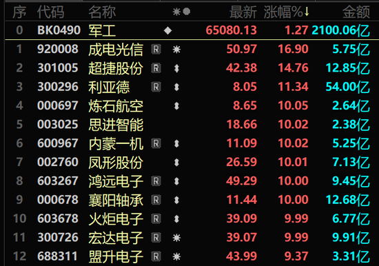 市场热点方面,军工股近来持续上涨,今日再度全线上扬,地面兵装方向领涨,板块指数放量大涨逾5%,创2年来新高,日K线连续第7日收阳。内蒙一机直线拉涨停,中兵红箭、国科军工等也大幅拉升。