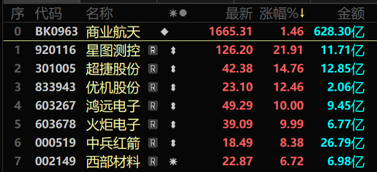 商业航天也连续7日上涨,板块指数创历史新高,军工电子、航空装备、军民融合、大飞机等细分板块也纷纷连续拉升,并均创出阶段性新高。炼石航空鸿远电子、怡亚通、火炬电子等强势涨停。
