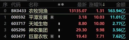 农林牧渔行业今日也全面上扬,林业、猪肉、饲料、农业化工等细分板块集体创年内新高。平潭发展、天域生物、神农集团、统一股份等强势涨停。